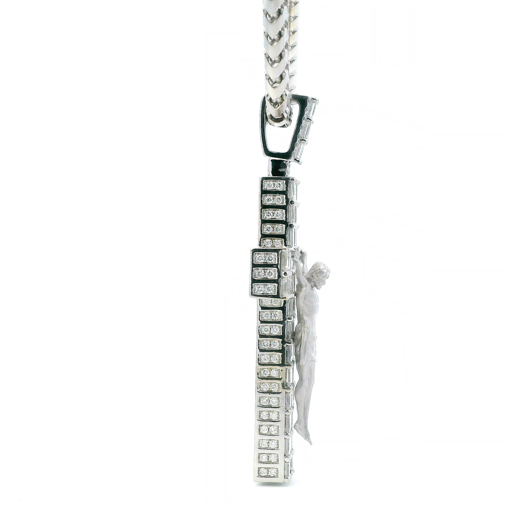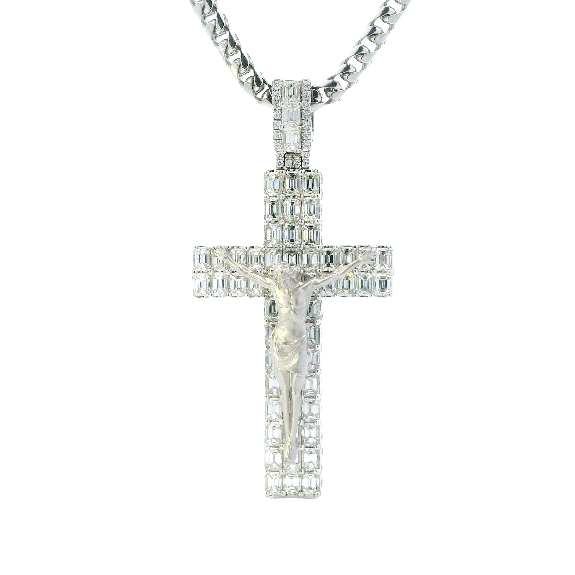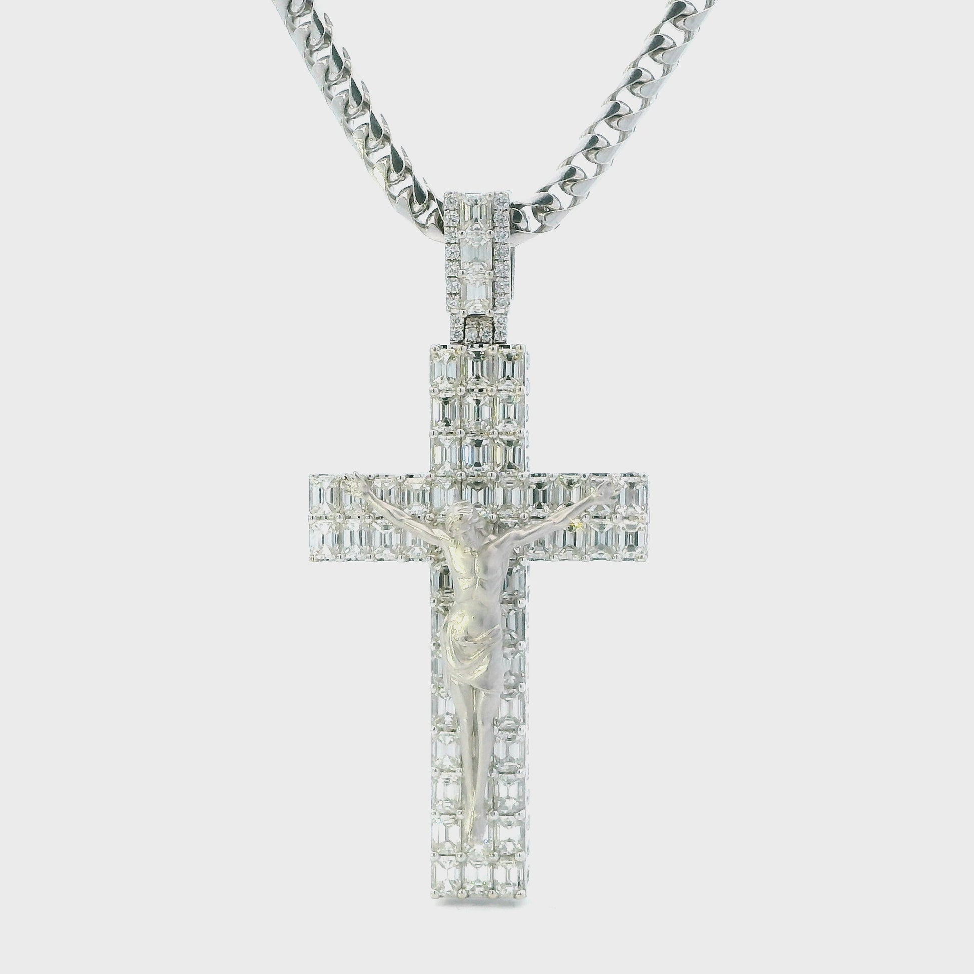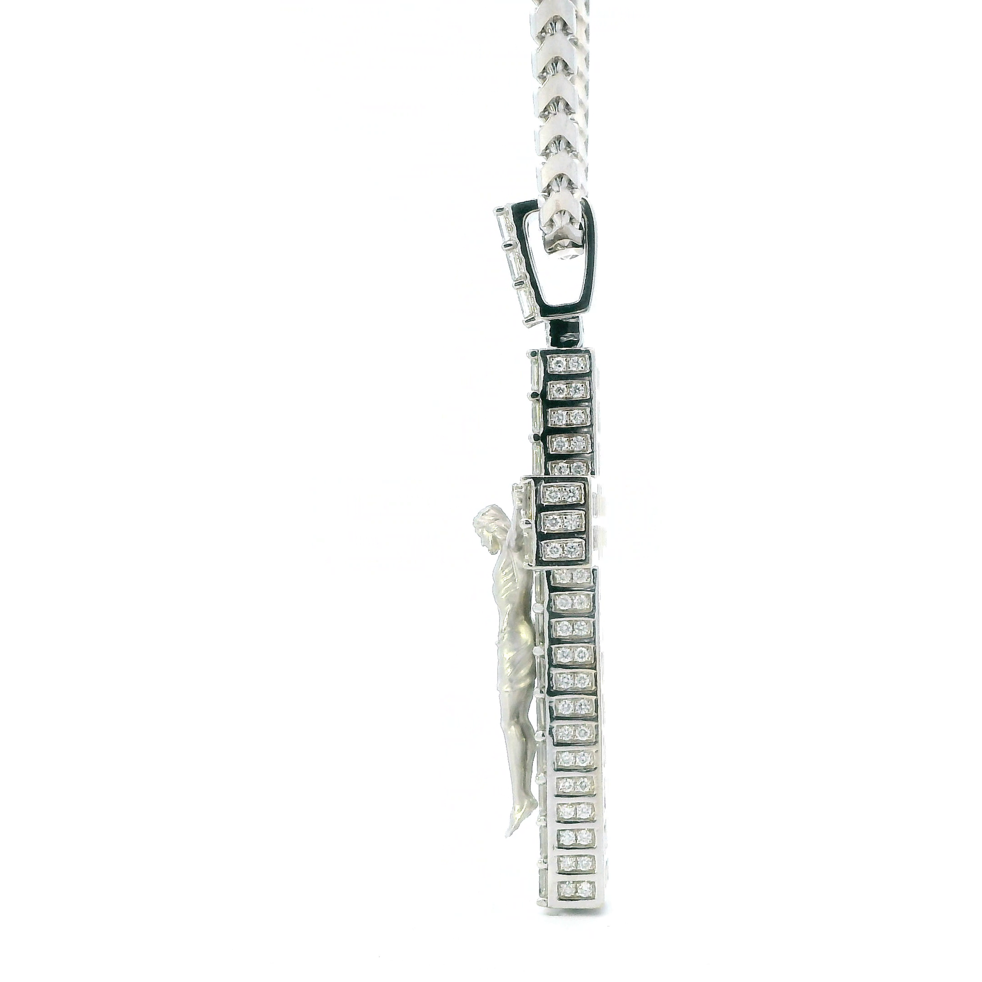 14K White Gold Diamond Crucifix Pendant & 23.75" Franco Chain - 11.96ct