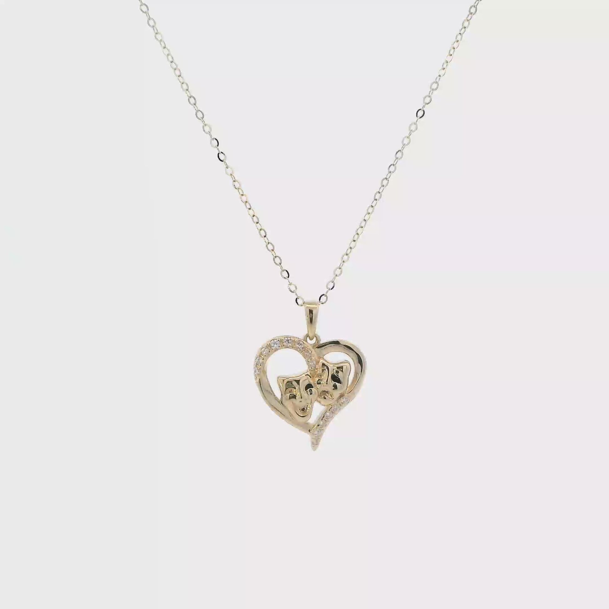 This is a beautiful gold comedy/tragedy mask heart pendant & cable chain that is in clean preowned condition. It has been authenticated and polished by our in-house goldsmith / gemologist.
