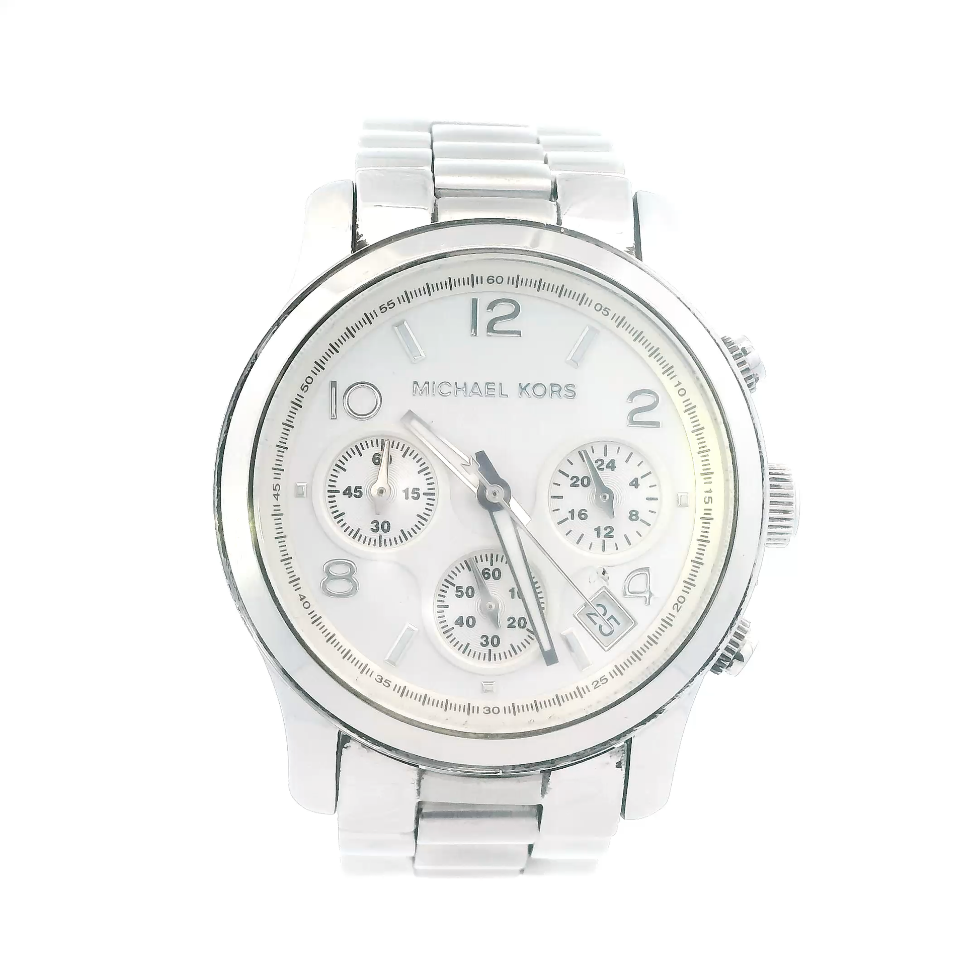 This is a beautiful Michael Kors Berkley silver tone wristwatch that is in clean preowned condition. It shows little to no signs of wear. It is fully functional and ready for wear.