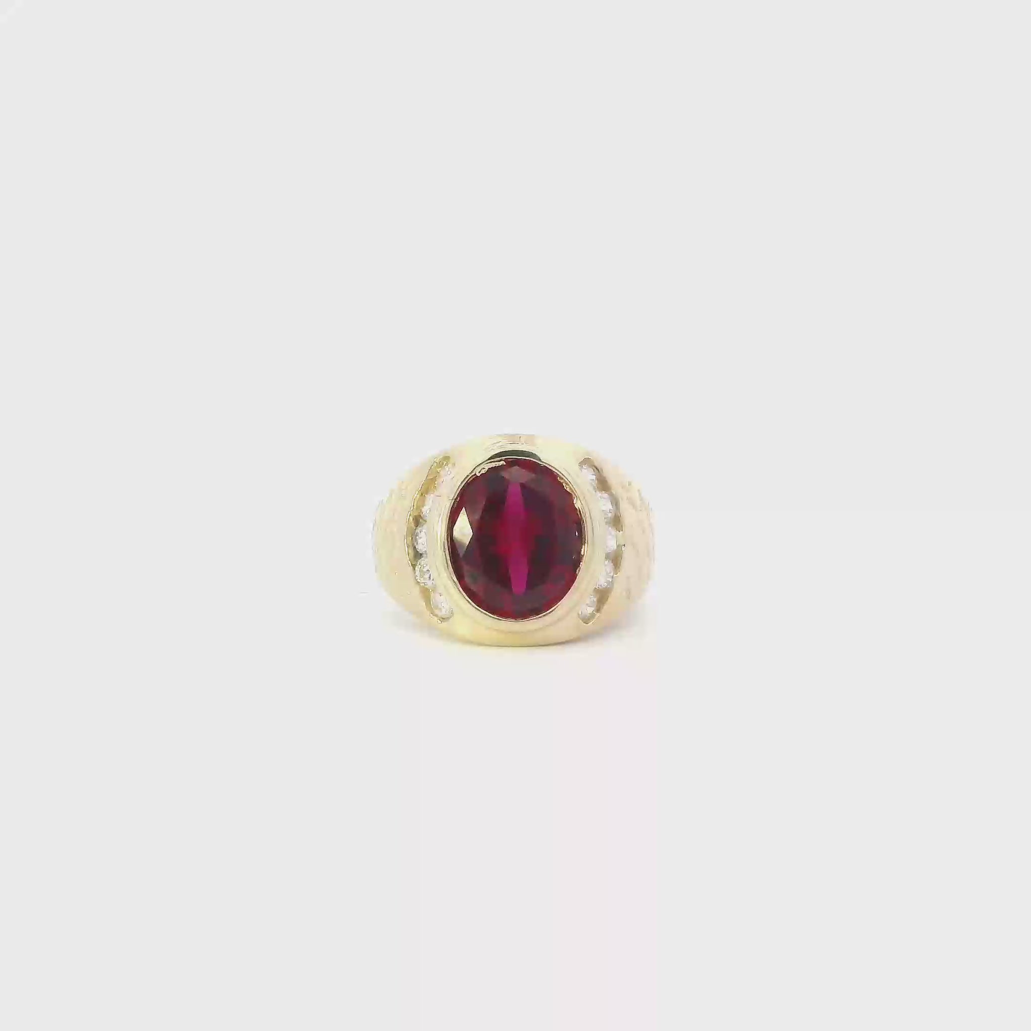 This is a beautiful gold synthetic ruby ring that is in clean preowned condition. It has been authenticated and polished by our in-house goldsmith / gemologist.