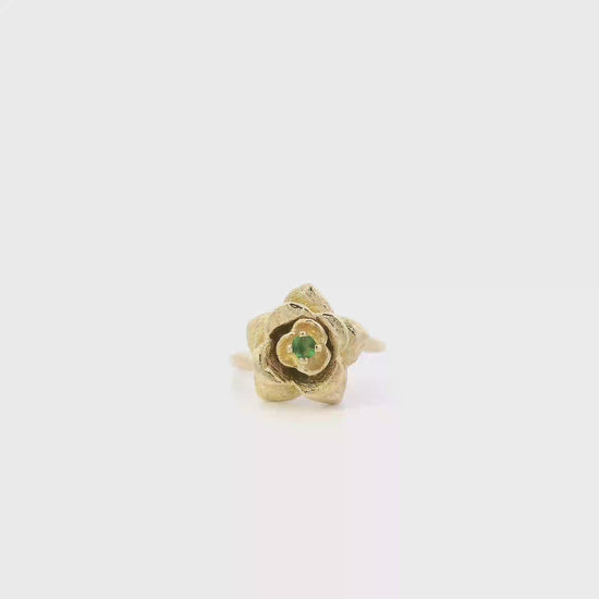 This is a beautiful gold emerald flower ring that is in clean preowned condition. It has been authenticated and polished by our in-house goldsmith / gemologist.