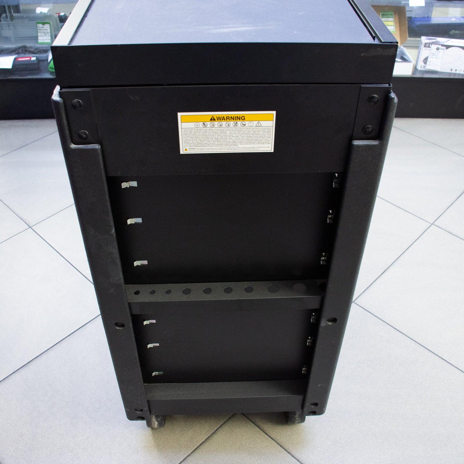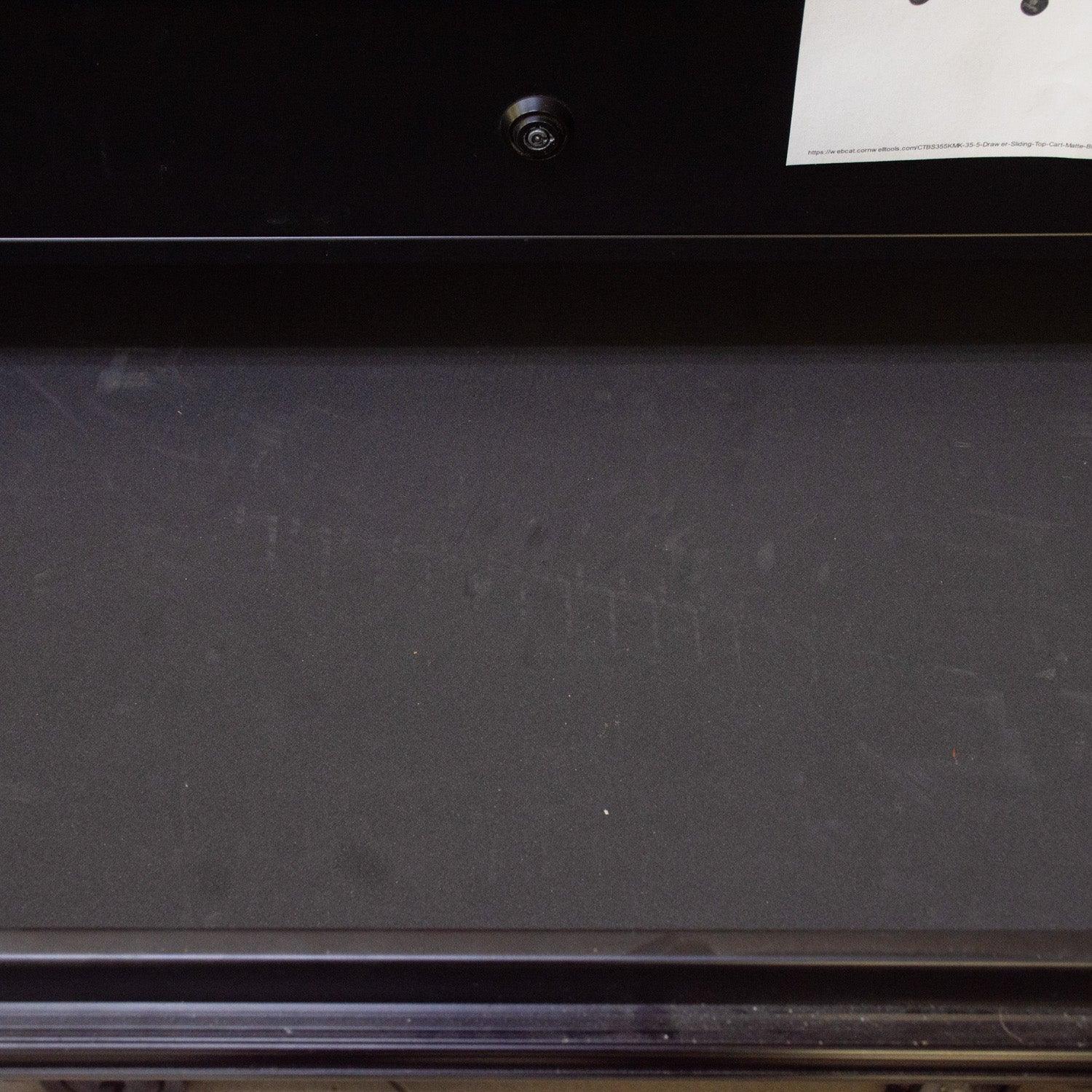 This is a preowned drawer cart in excellent almost unused condition showing minimal signs of use such as dirt/debris and light cosmetic scratches. It is Matte black with black wheels.