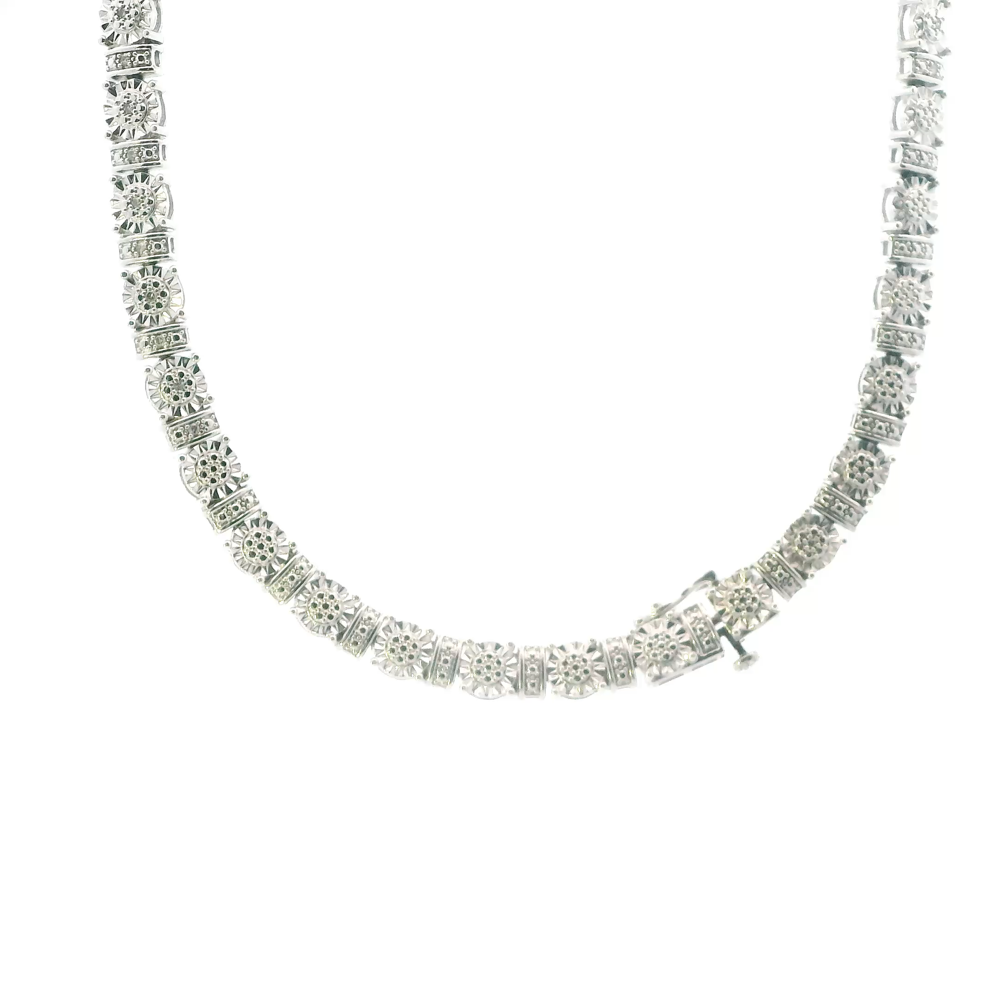 This is a beautiful sterling silver diamond necklace that is in clean preowned condition. It has been authenticated and polished by our in-house goldsmith.