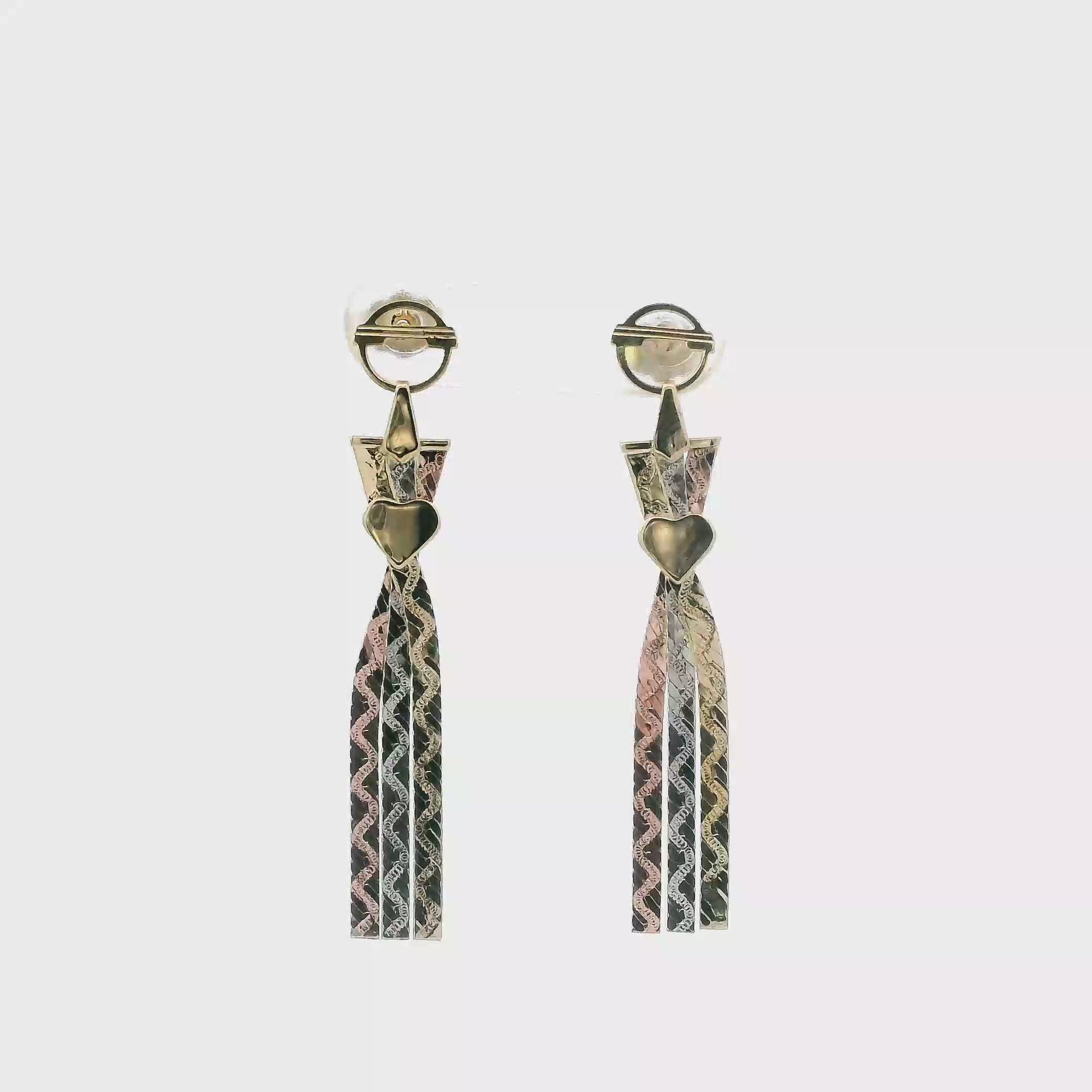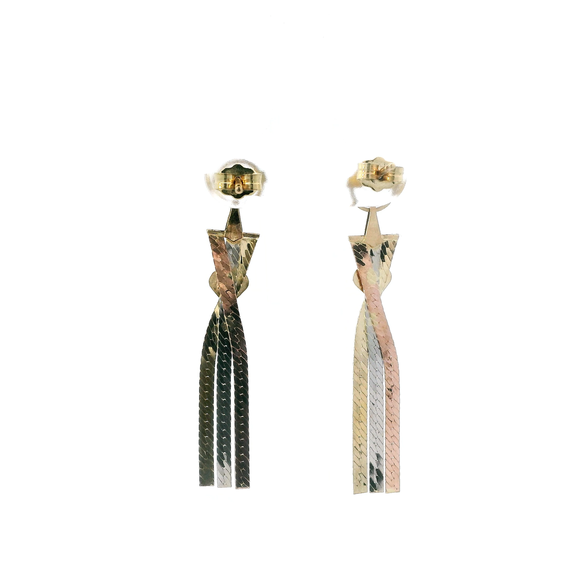 14K Tri Color Gold Triple Strand Herringbone Heart Dangle Earrings