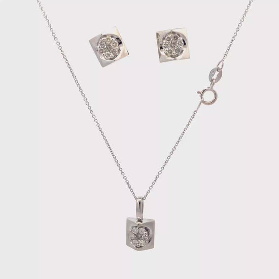 This is a beautiful diamond earrings & diamond square pendant with cable chain set that is in clean preowned condition. It has been authenticated and polished by our in-house goldsmith / gemologist.