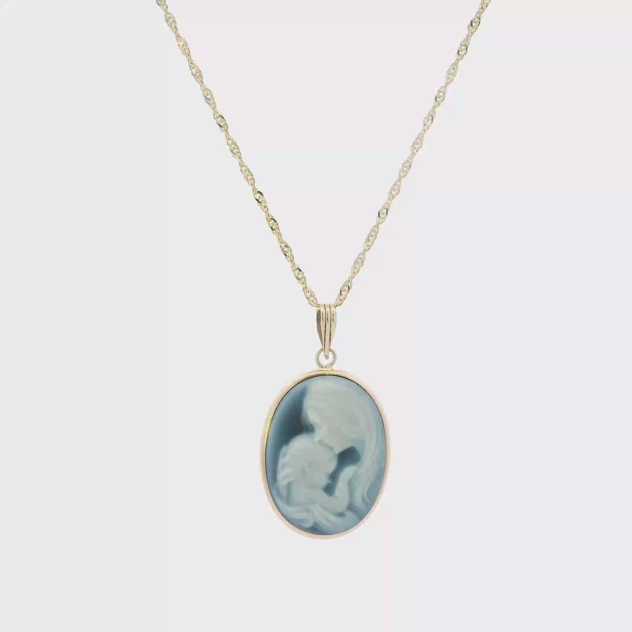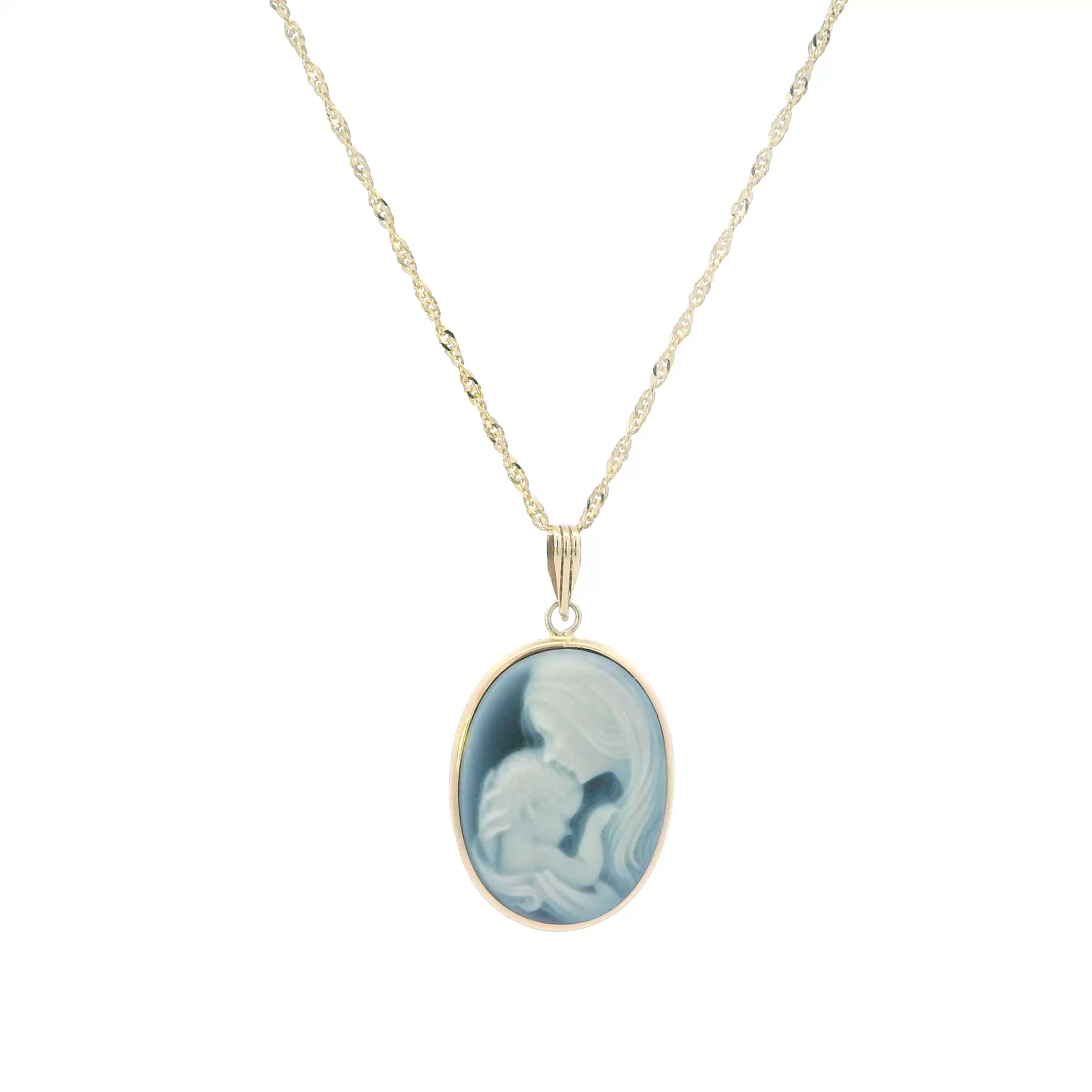 14K Yellow Gold 18" Twisted Chain And Blue Mom & Baby Cameo Pendant