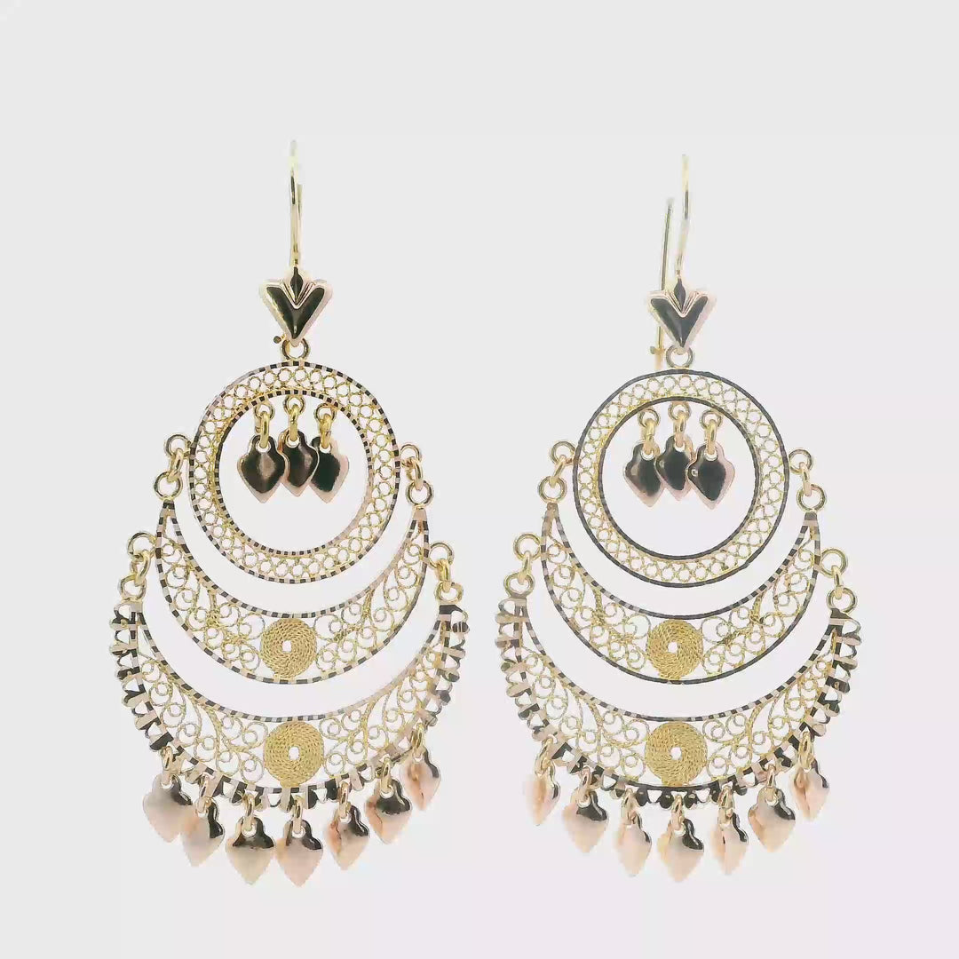 14K Yellow Gold Filigree Chandelier Dangle Hearts Earrings