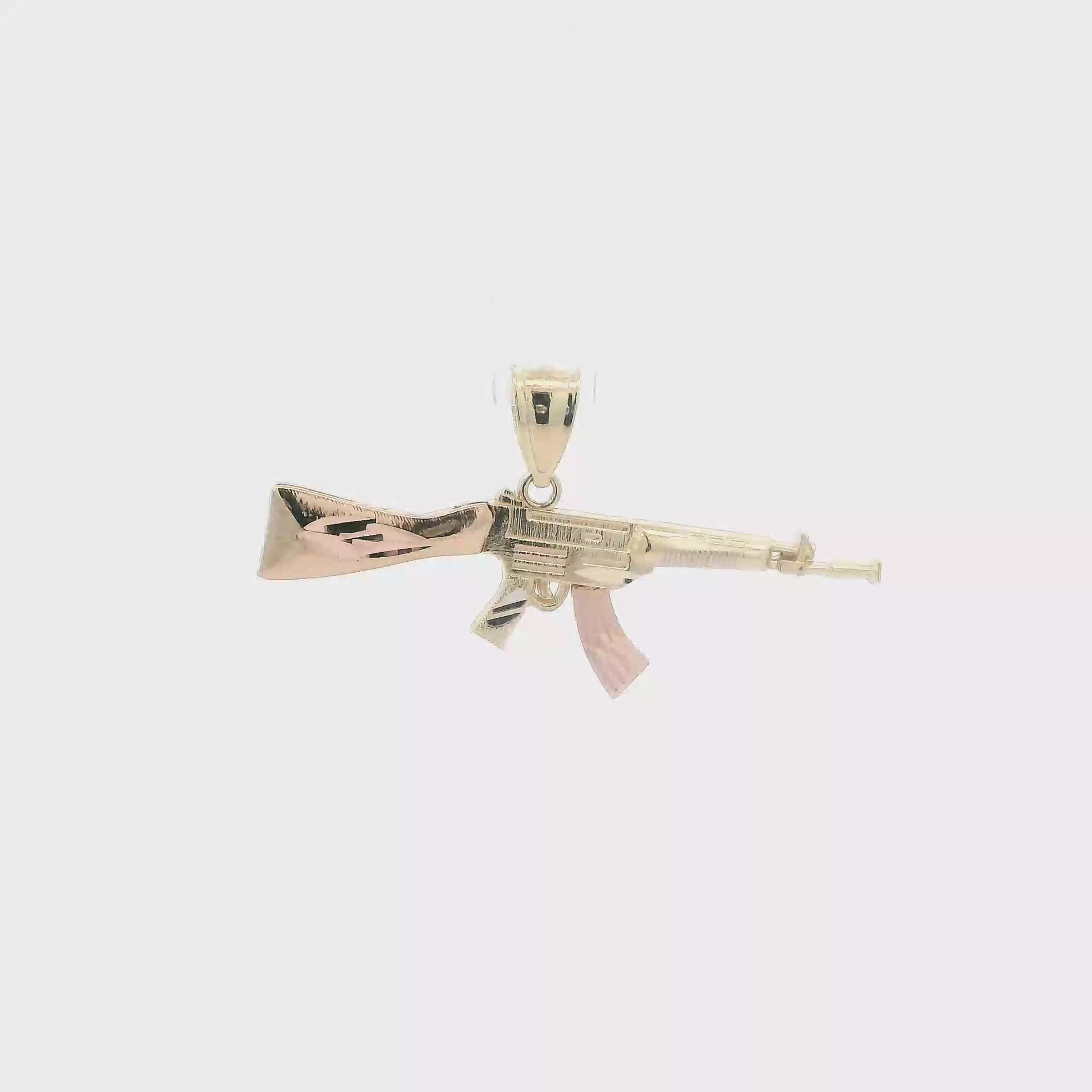 This is a beautiful gold AK-47 rifle pendant that is in clean preowned condition. It has been authenticated and polished by our in-house goldsmith / gemologist.